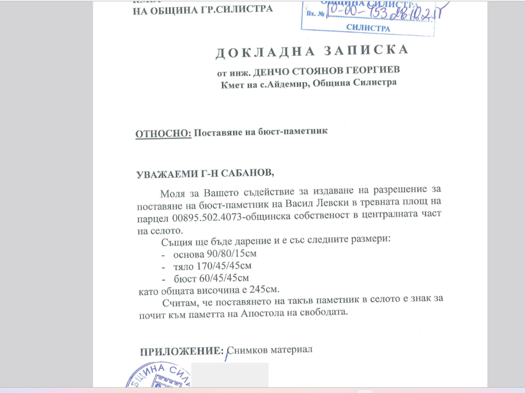 Предложение да бъде поставен бюст паметник на Васил Левски в центъра на село Айдемир ще разгледа общинския съвет на Силистра на предстоящото редовно заседание.
